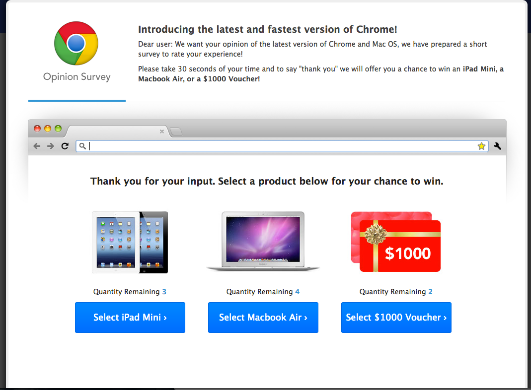In other cases, the victim is only redirected to a pay-per-click scam that promises "Free Vouchers" and free Apple products, but fails to deliver.