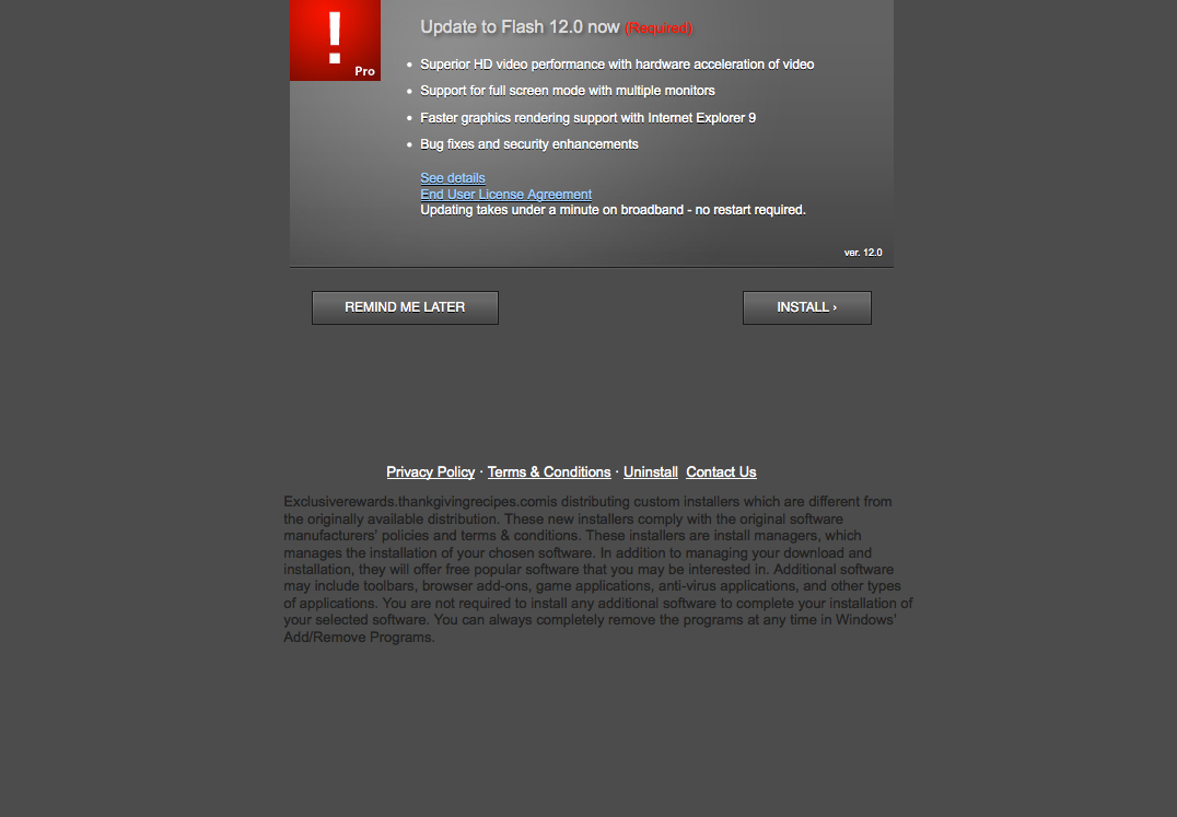 The above picture is the only visible addition to this page. After clicking on the link, the victim is immediately sent to a page that leads them to suspect their Browser/Flash version is not up to date.